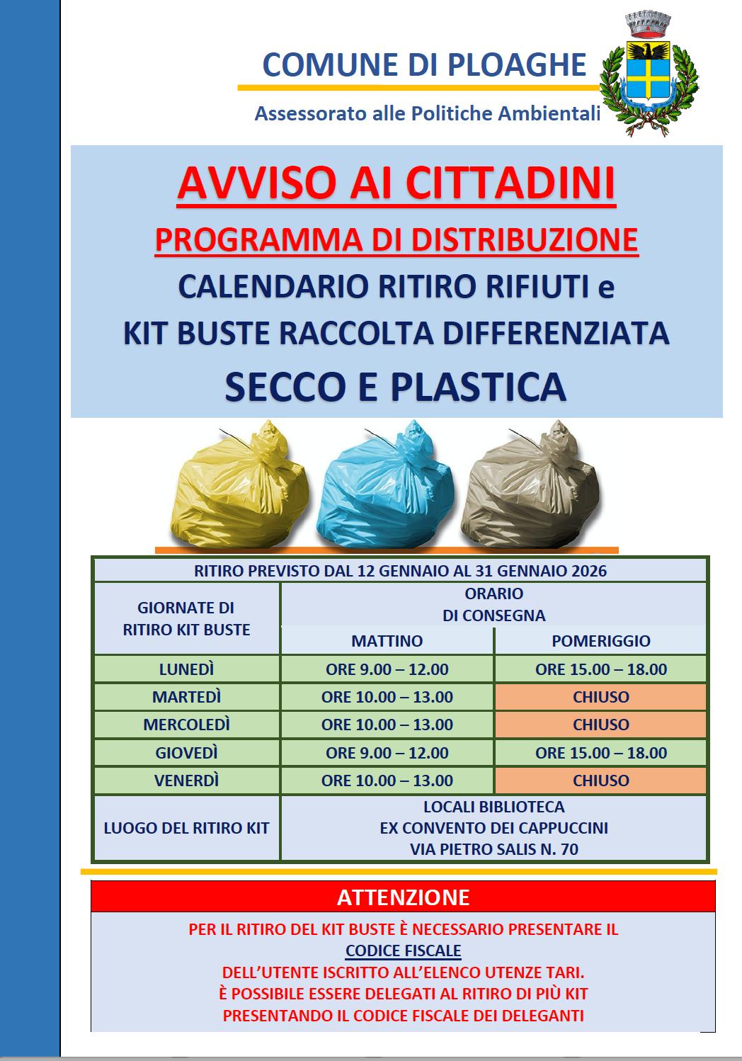 Si comunica a tutti i cittadini che a partire da lunedì 12 gennaio, presso i locali della Biblioteca (ex Convento) in via Pietro Salis 70, saranno distribuiti i calendari e le buste per la raccolta differenziata.